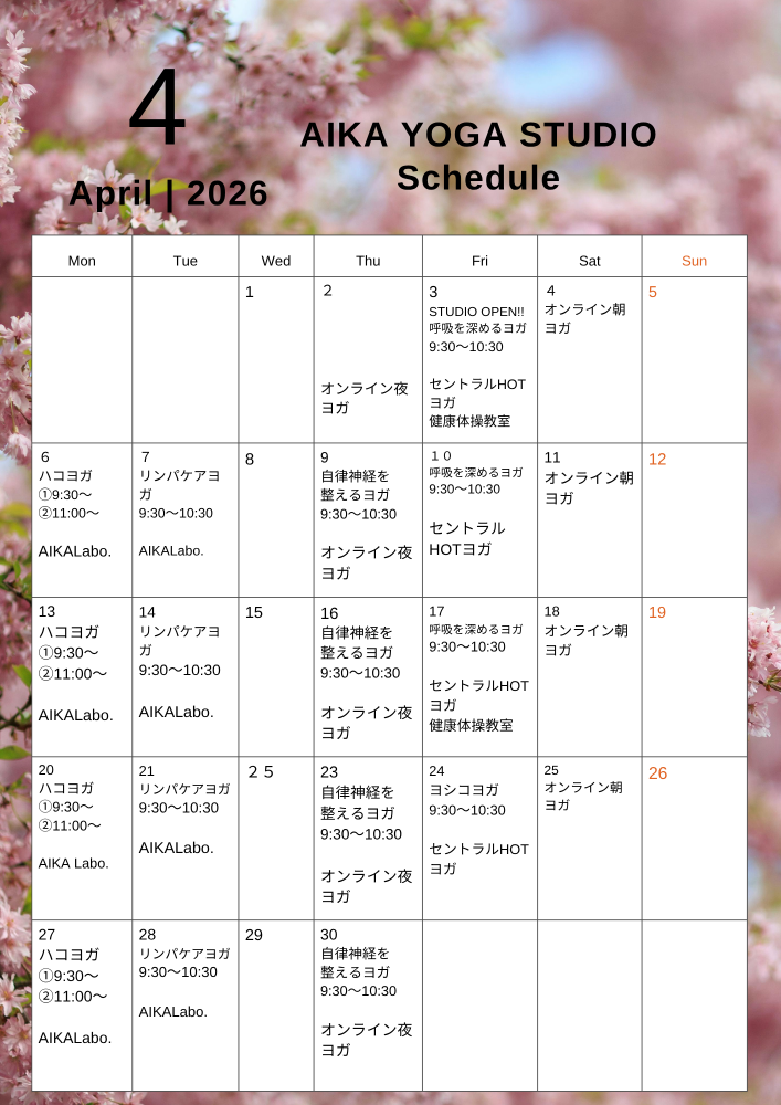 ☆AIKAYOGA STUDIO(9:30〜10:30)