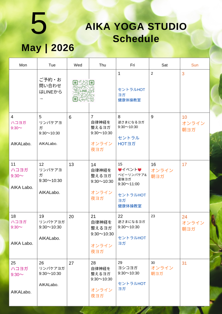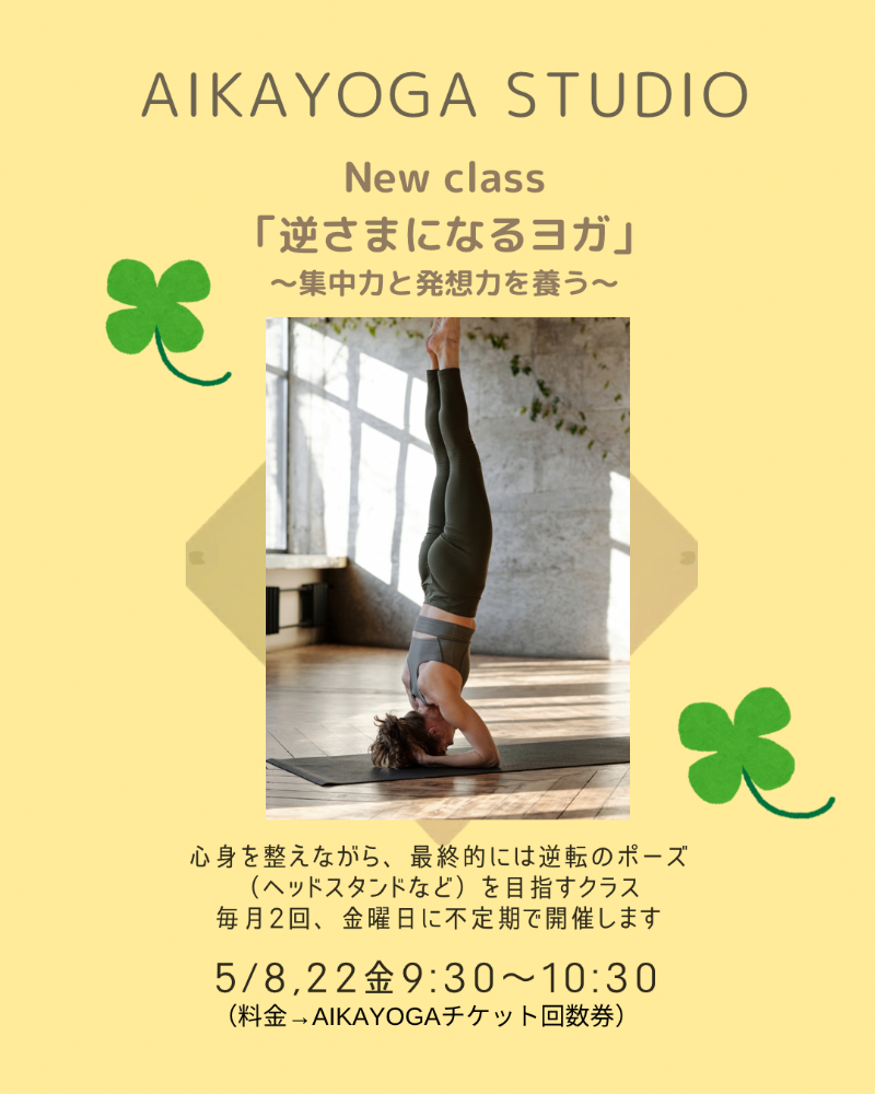 2026.4.17 5月から月2回「逆さまになるヨガ」のクラスを金曜日に行います。逆転のポーズ(カラスのポーズ、三点倒立、頭立ち)の完成を目指すクラスです。5月は8,22日に開催しますので、やってみたいという方はご予約お待ちしてます。